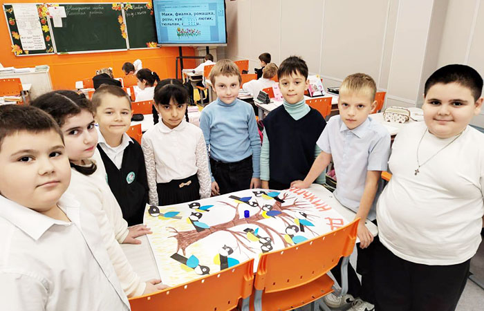 Ученики 2 класса на внеурочном занятии сделали из цветной бумаги синичек и оформили плакат к празднику